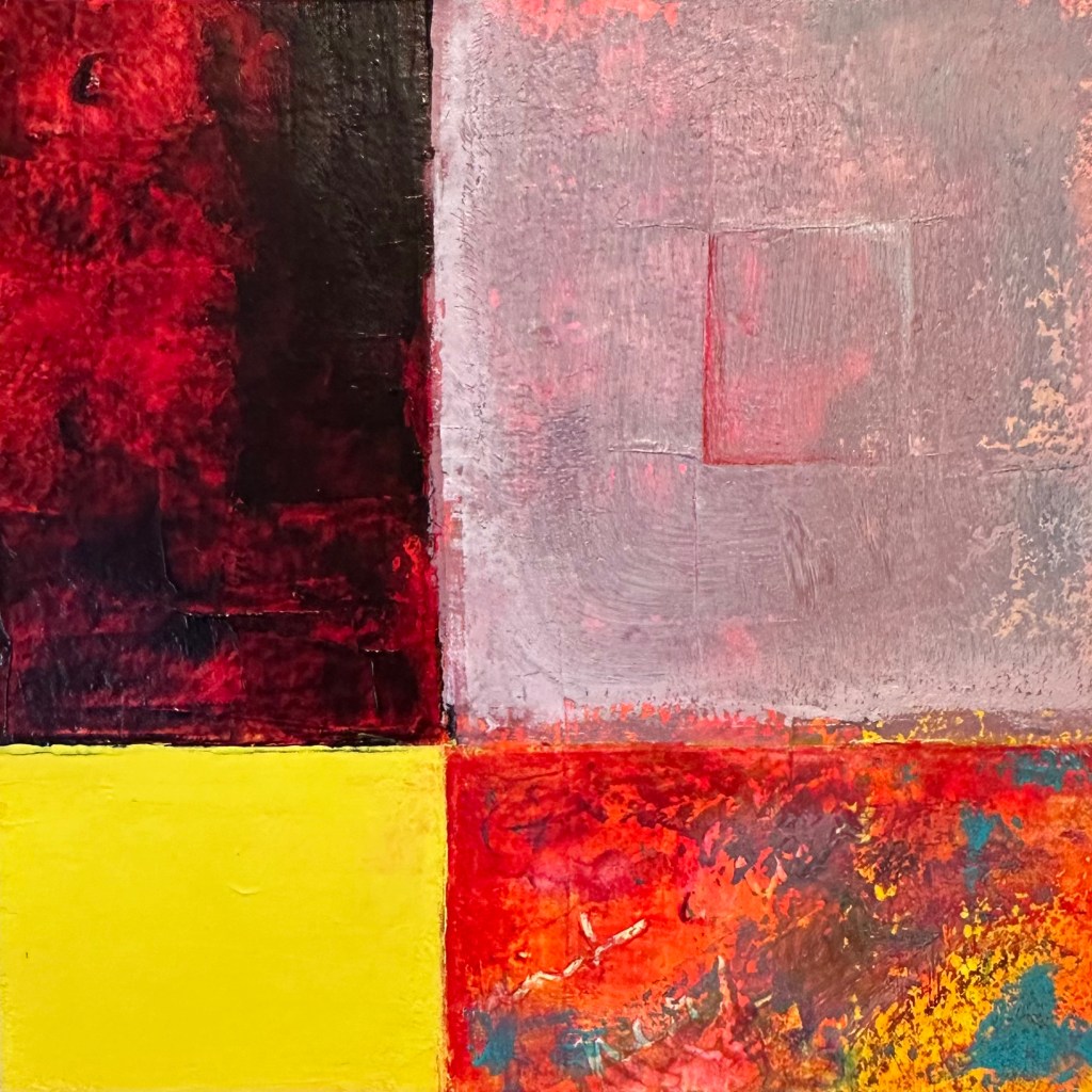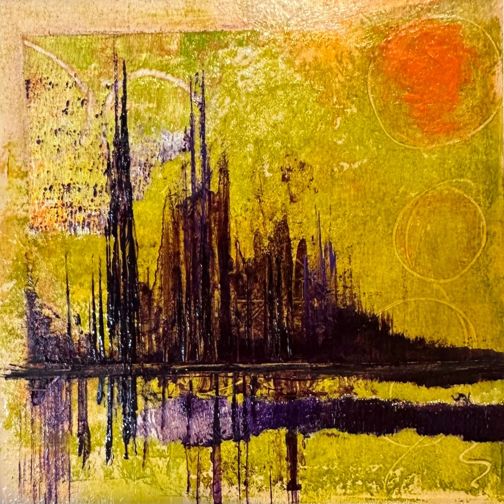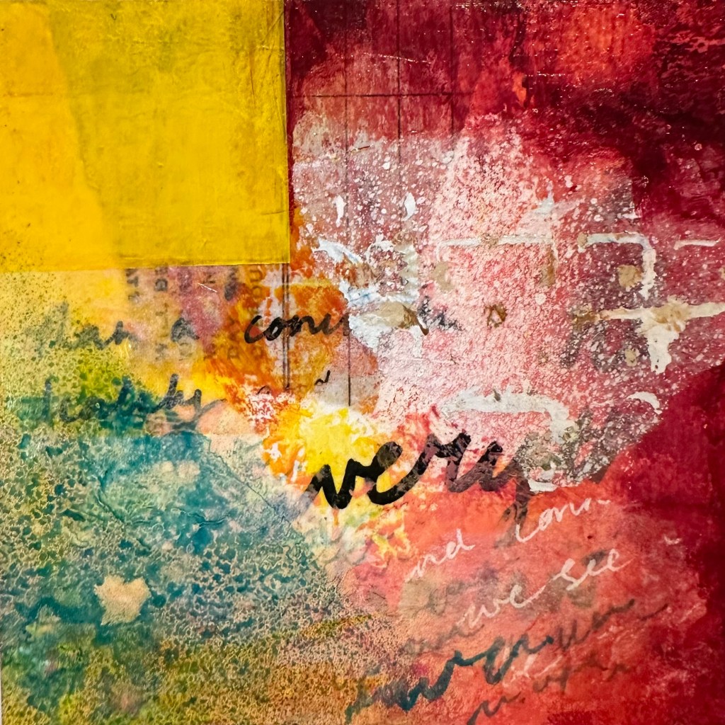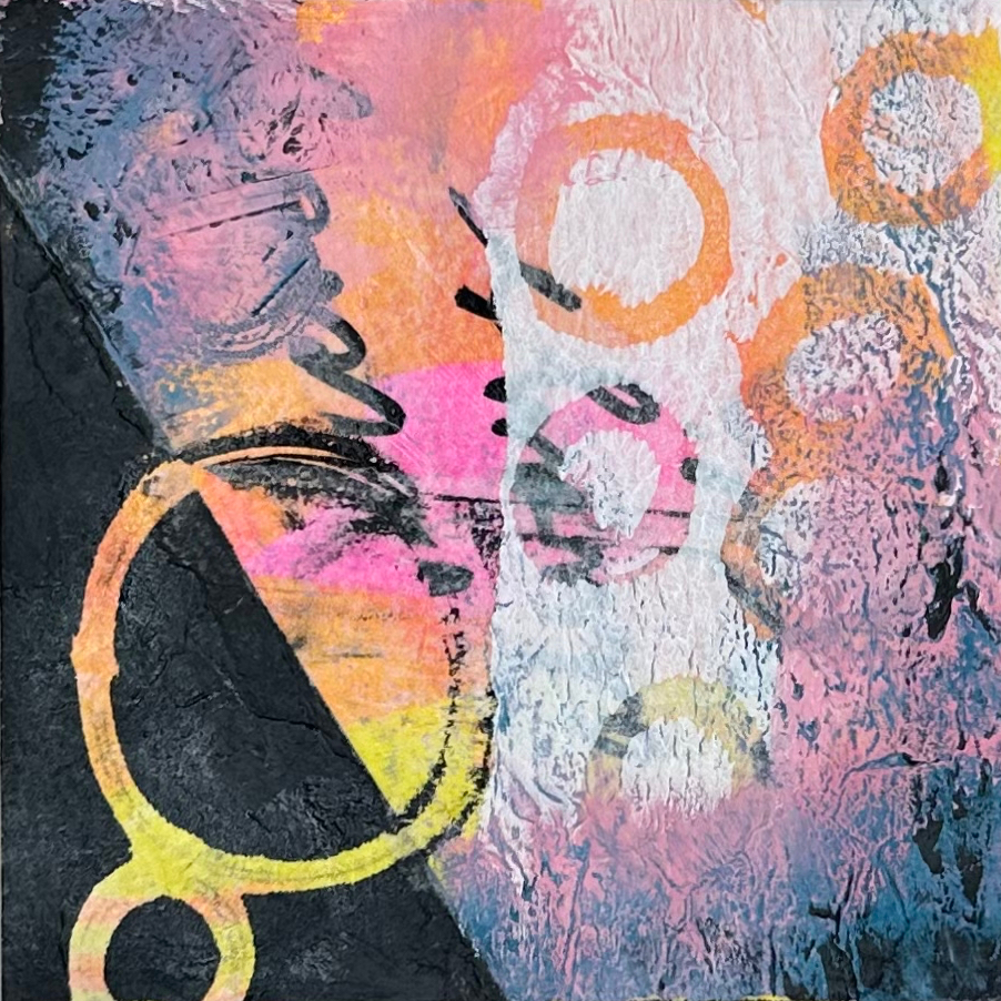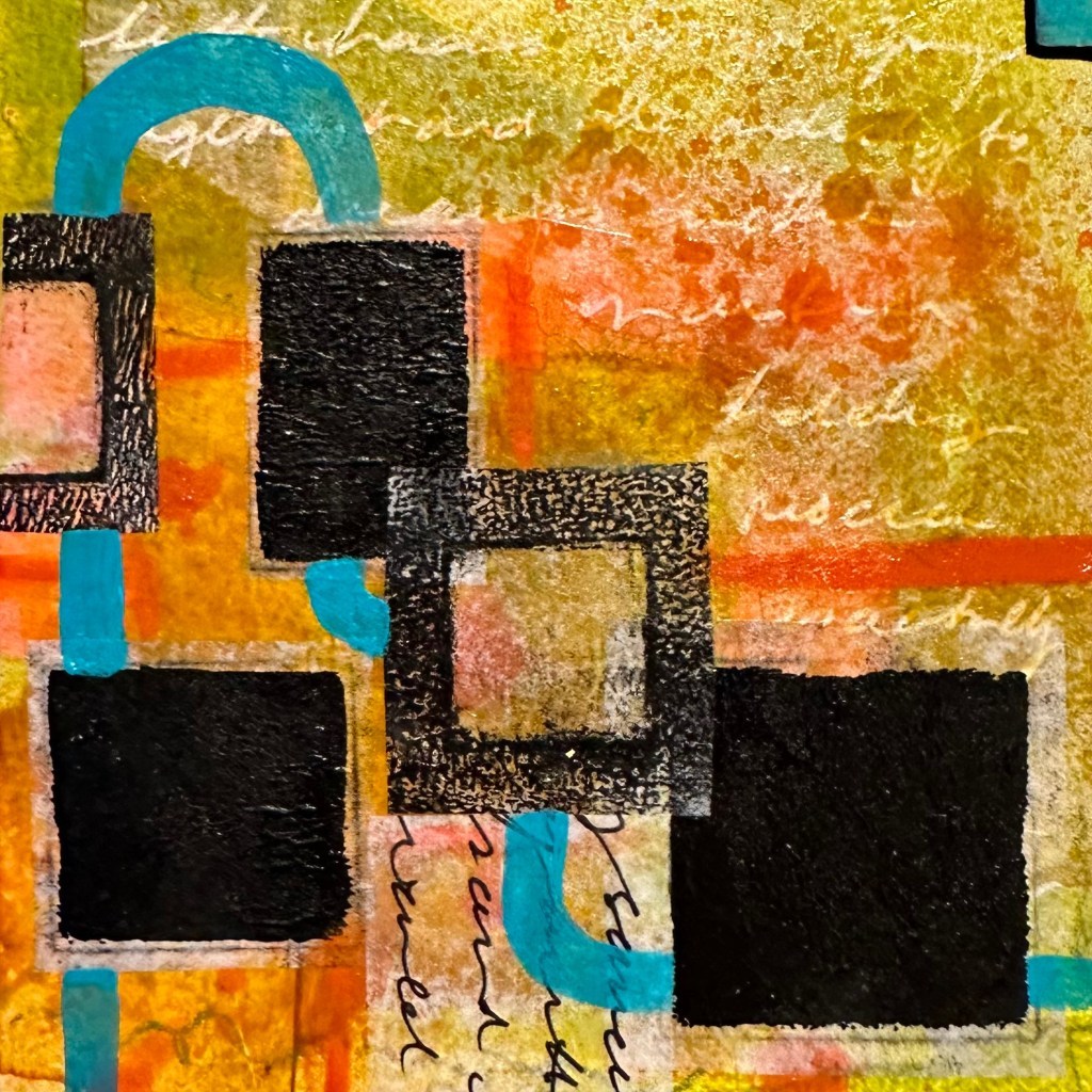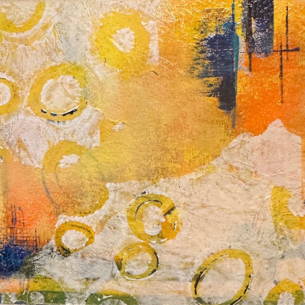 These small 4.5×4.5″ playful pieces are part of an exploration in color, texture and technique in mixed media and collage. They have been a joy to create. They add a splash of intrigue and color to any small space.