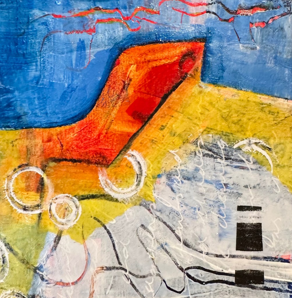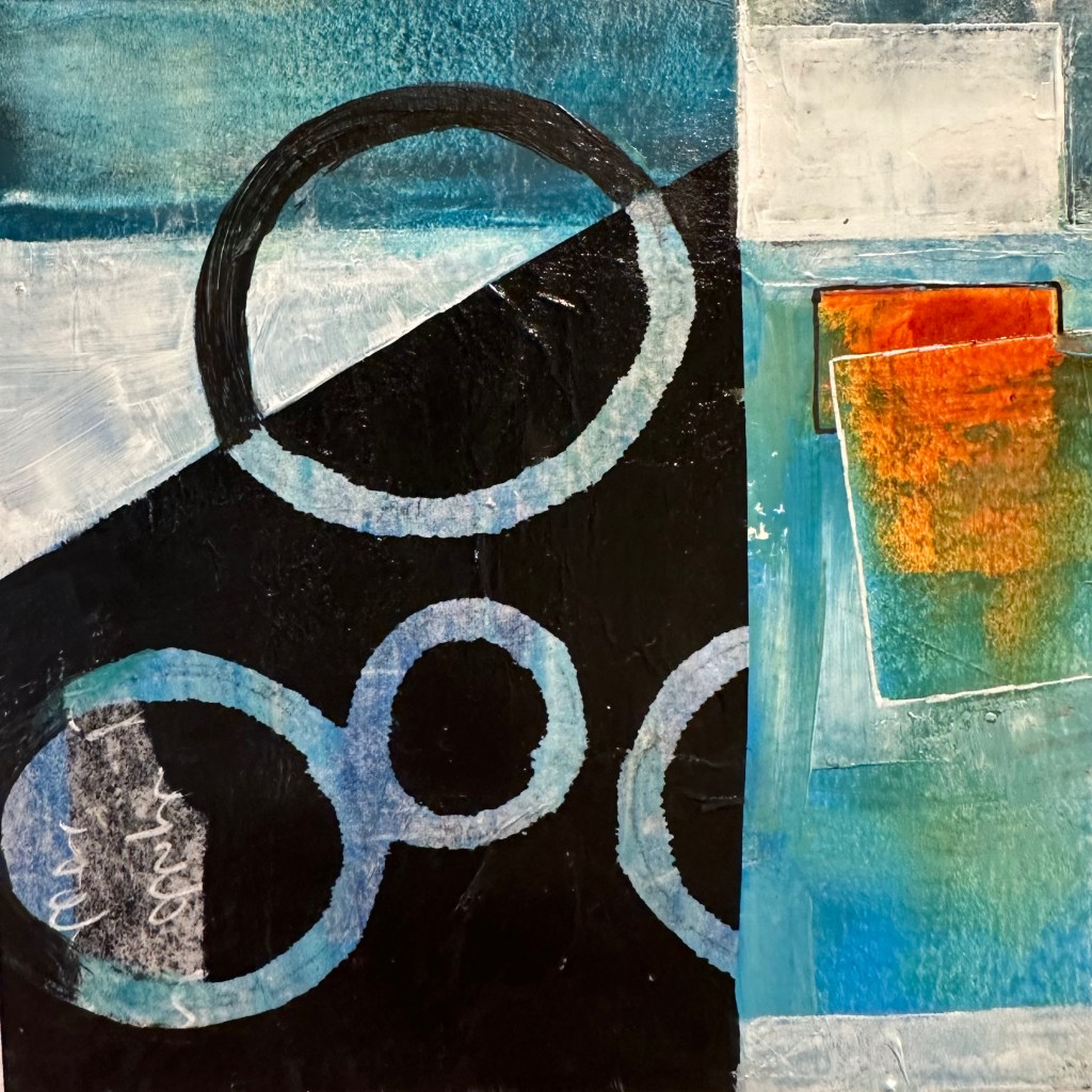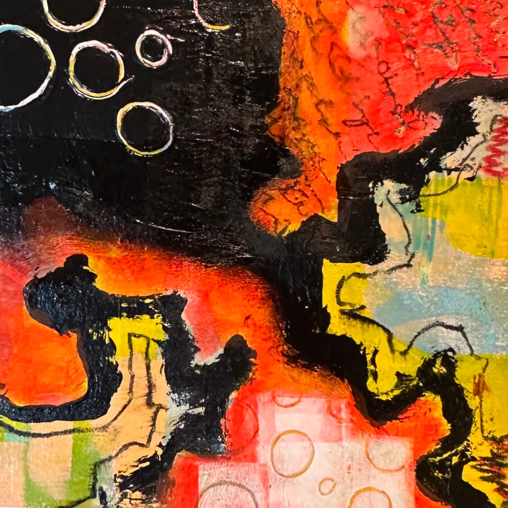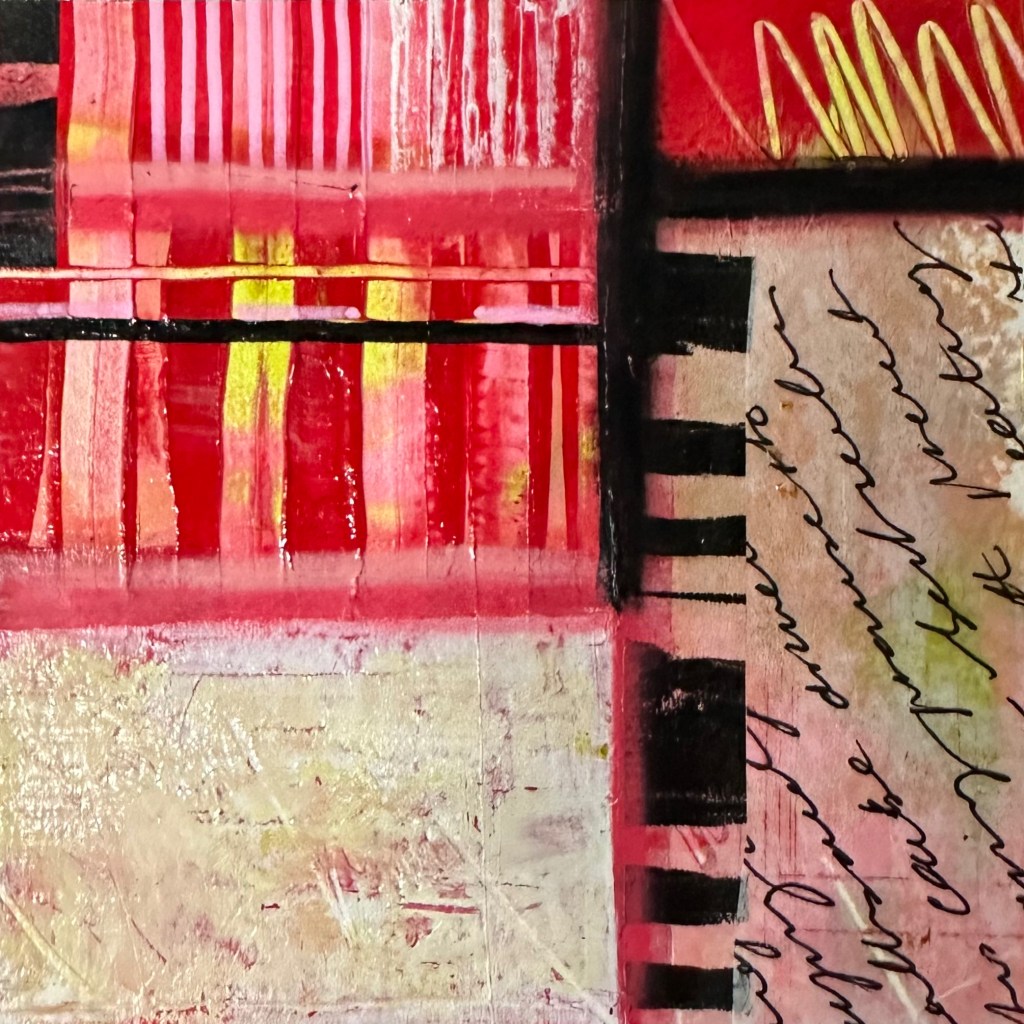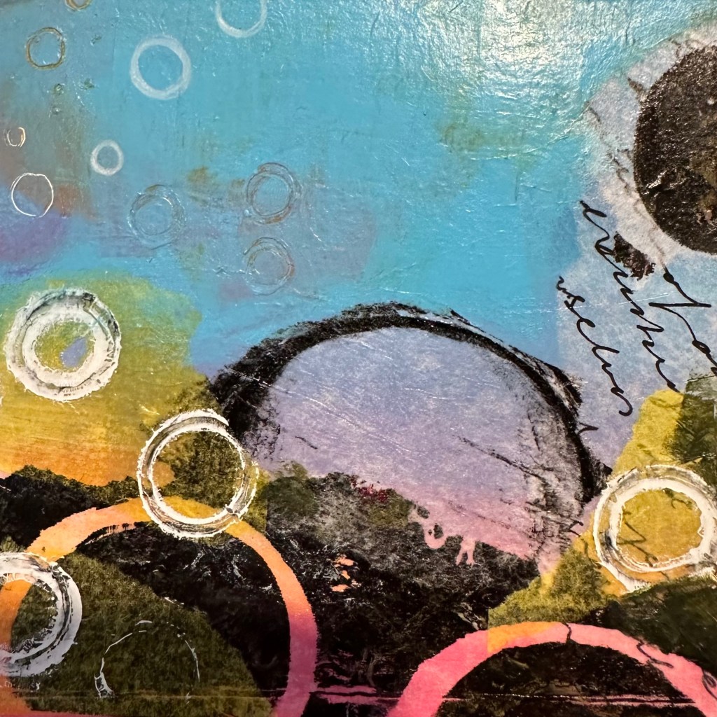 These small 4.5×4.5″ playful pieces are part of an exploration in color, texture and technique in mixed media and collage. They have been a joy to create. They add a splash of intrigue and color to any small space.